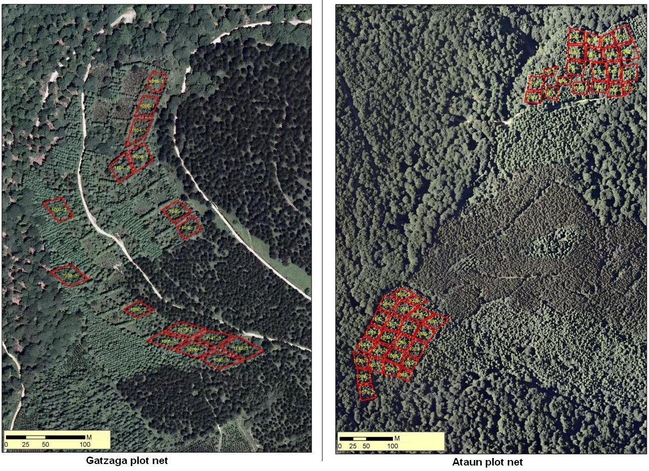 In the Gatzaga plot net 45 plots were installed (15 provenances*3 blocks each) of 81 plants, 729 m2 per each plot. In 2012, only 16 plots are still alive and ready to measure (568 trees in total). In the Ataun plot net 45 plots were installed (15 provenances*3 blocks each) of 81 plants, 729 m2 per each plot. In 2012, all the plots are alive and ready to measure (2.014 trees in total).The first step was the data collection of the same trees along the years. A database was created with these data. During the Reinfforce project, all the trees were measured by diameter and total height: 2.582 trees. All the trees are located by row and column in each plot. An analysis with all these data is expected along the final year of the project. Relationships between provenances, growth and climatic damages will be studied.