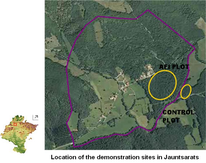 The global objective is to develop a new silviculture to slow the impacts of climatic change compatible with the production of quality wood of oak and with sustainable cost. The main objective of these demonstration trials is to study if uneven-aged forests (new silviculture) are more resistant to multiple climate change risk (strong winds, new pest and pathogens and less availability of water) than even-aged forest.This demonstration site is located in Jauntsarats, in the Northwest of Navarra. The forest is part of two M.U.P (Montes de Utilidad Pública = Public Use Forest) of Navarra. Therefore, the managing of them corresponds to Government of Navarra. Jauntsarats forest belongs to Southern humid valleys of Navarra, with hard winters and hot summers. The average annual precipitation is 1273 mm (from 1999 to 2007). Orography is not very steep, with slopes no more than 30%, and flat terrain next to Basaburua river. Soils are deep and not very rocky with predominance of marl and limestone and fine silty texture. Waterlogging problems can appear. The main especies are Quercus robur L. (38,15 ha), Fagus sylvatica (19,87 ha) and Quercus pyrenaica (11,82 ha), with Rubus sp. and Ilex sp. in the scrubland. The first Technical Management Plan for this forest was approved in 2009, and there is not disposable information about its managing before 2002. The main specie in this demonstration site is Quercus robur L., both in the control plot as in the AFI trial. The existing forest mass is characterized by high number of young trees which belongs to lowest diameter class. Quality of trees is not very high, but enough number of young trees has potential to produce quality timber. Due to the current state of the mass the growth of Fagus sylvatica L. is much favoured than oak growth, but this is supposed to change with the new sylvicultural treatment. Through this demonstration site a change in the sylviculture will be studied, from a regular high forest system, to an individualized tree sylviculture for the Quercus robur L. specie. These changes are being made in a plot part of the AFI (Association Futaie Irrégulière) plots network, where the objective is to use the PROSILVA management resulting in an irregular stand. In addition to that AFI plot, a control plot is being installed in a part of Jauntsarats forest where no actuation is planned for at least the next ten years, so the forest will not change in a short term. The main climate change risks for forest are: strong winds, new pest and pathogens and less availability of water. The hypothesis is that uneven-aged forests should be more resistant and resilient to those risks because: Their relation between height and diameter used to be lower in this kind of forest structure and it supposes bigger resistance to strong winds. An uneven-aged forest, with different ages and species within it, is more resistant to pest and pathogens outbreaks. These forests have a better use of ground water. In the AFI plot located in Jauntsarats the aim is to carry out the transition from a regular stand to an irregular stand where different species and diameters are mixed, maintaining pedunculate oak dominance and producing high quality trees.