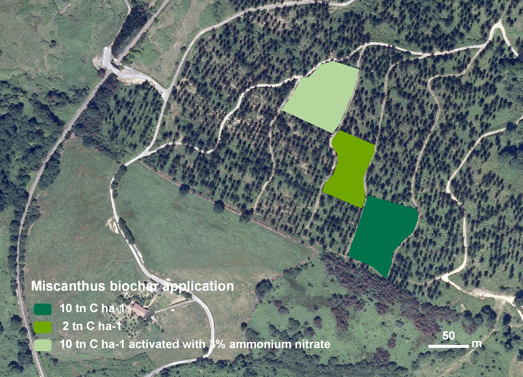 The sylvicultural option to be demonstrated is the application of biochar (B) to forest soils to improve soil water holding capacity in order to adapt to Climate Change. A randomized complete block design was used to establish the experiment (3 blocks and 3 replicates per block) and the experimental treatments consist of 9 Mg C/ha of B, 3 Mg C/ha of B, 9 Mg C/ha of B + 200kg ammonium nitrate. Each plot covered 64 m2 with 4 trees inside.