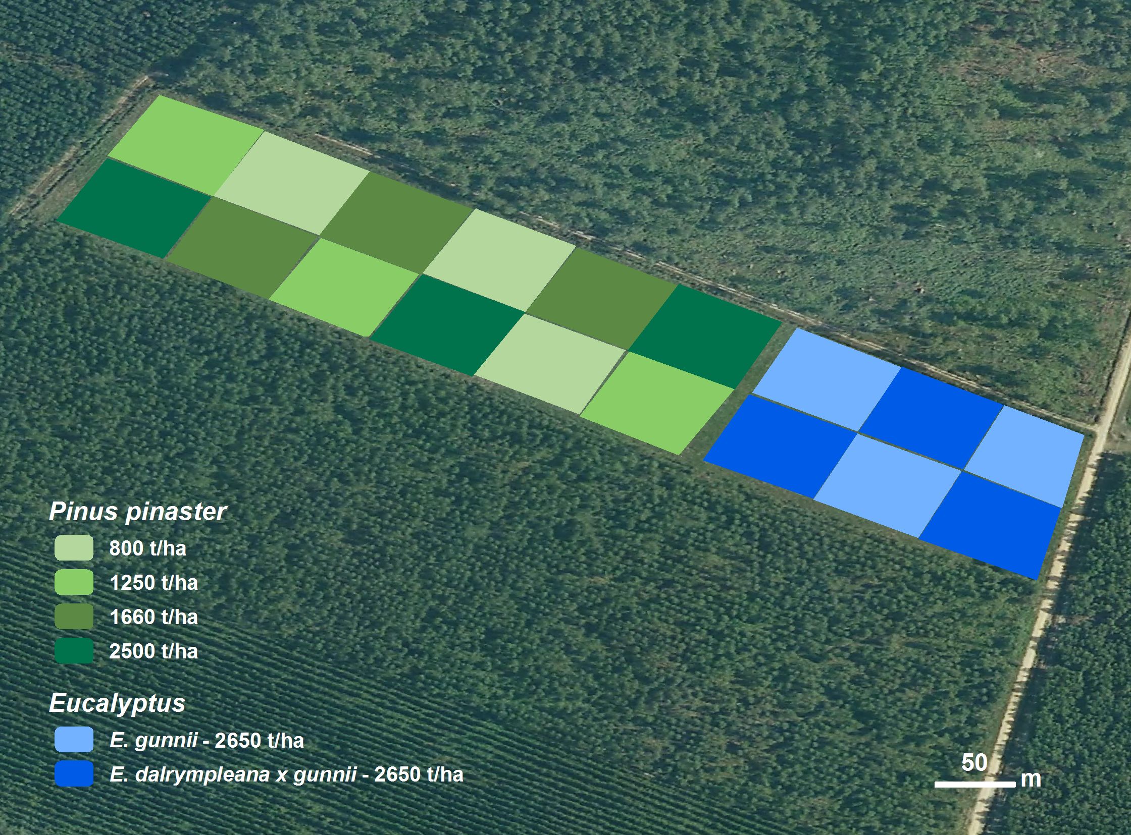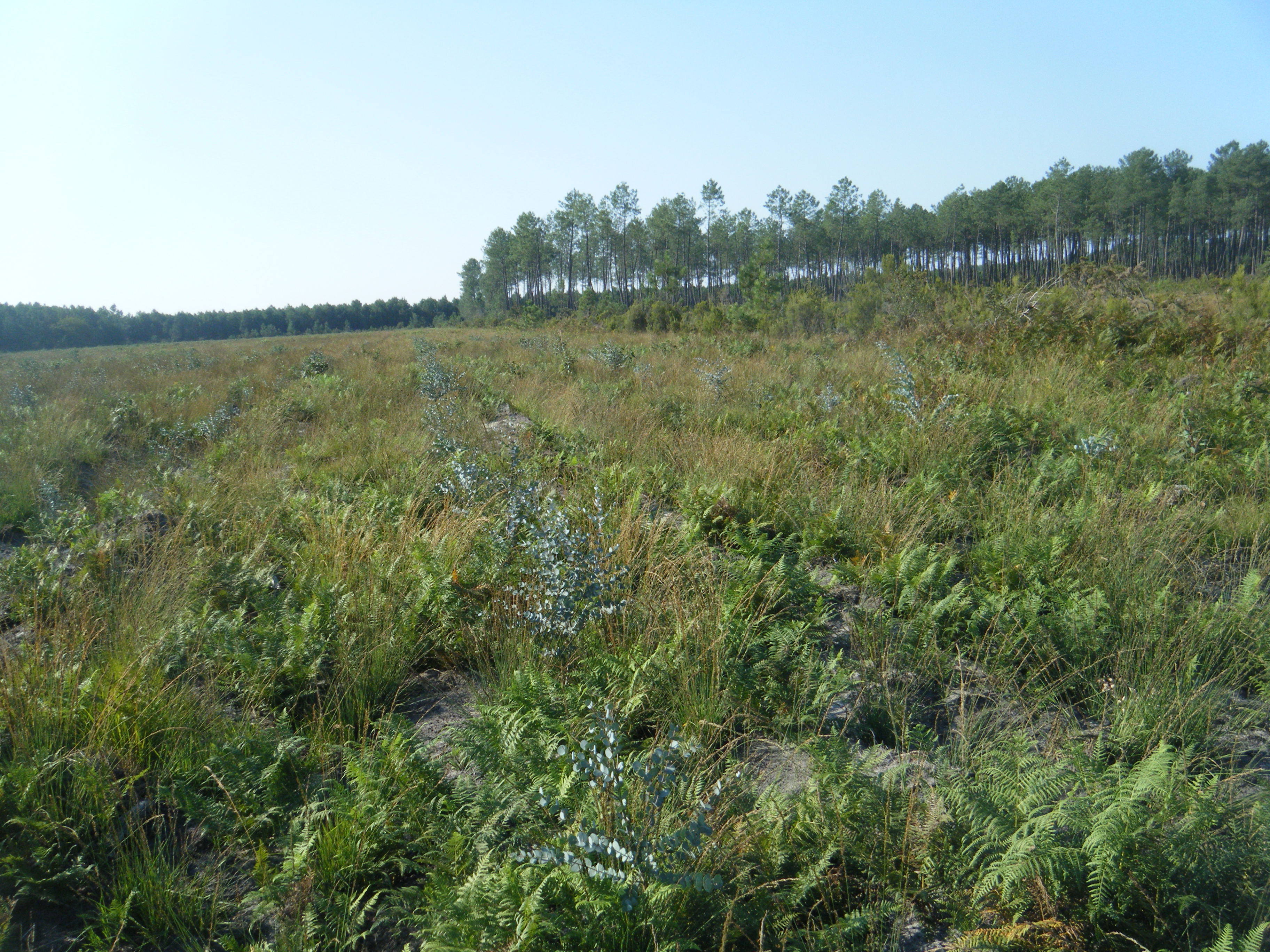 MAIN SYLVICULTURAL OPTION DEMONSTRATED : short term sylviculture in maritime pine and eucalyptus Factors of interest related to climate change in a short production cycle (25 years) with no clearing for risk limitation sensitivity to drought stand stability.STAND AND SITE DESCRIPTION Plantation of maritime pine, on a clear-cut area (3,05 ha) Plantation of Eucalyptus dalrympleana x gunnii (“Gundal”), on a clear-cut area (0,76 ha) Plantation of Eucalyptus gunnii, on a clear-cut area (0,76 ha).This demonstration site will be integrated in the GIS Pin Maritime du Futur (CRPF-CPFA, INRA, ONF, FCBA), and data shared with GIS PMF partners. Growth measurement campaigns will take place every 3 years (first height measurement will take place in autumn 2013). First survey (dead/alive) took place in spring 2012. The site will be used in information meetings organized for forest owners by CRPF-CPFA when sufficient data are available. Results will be used for technical information leaflet and papers on sylvicultural practices.