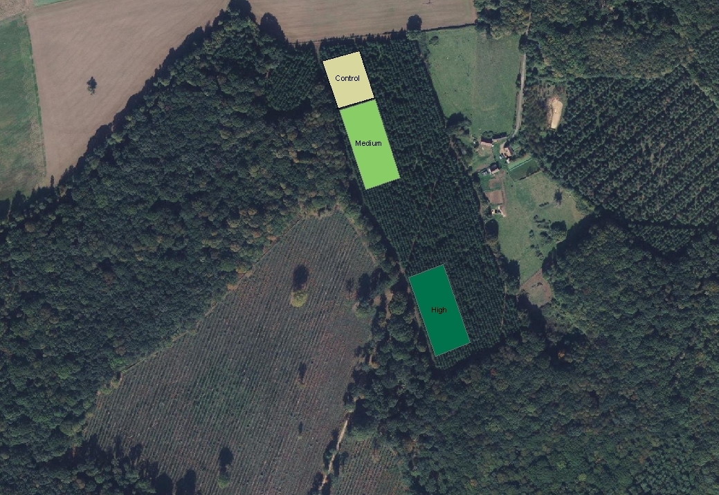 The global objective is to develop a new silviculture to slow down the impacts of climatic changes and to maintain the high quality wood production of Douglas-fir. The objective of this demonstration site on Douglas fir is to evaluate effect of sylviculture (thinning) on potential water stress.The Douglas-fir stand is 15 years old, and it's localised in a sensibility climatic area for Douglas-fir in France. Initial density is 1142 trees/ha.This demonstration site has 3 experimental plots : *Control, with no thinning *low thinning in 2012 (sampling rate of 35%) *high thinning in 2012 (sampling rate of 55%)