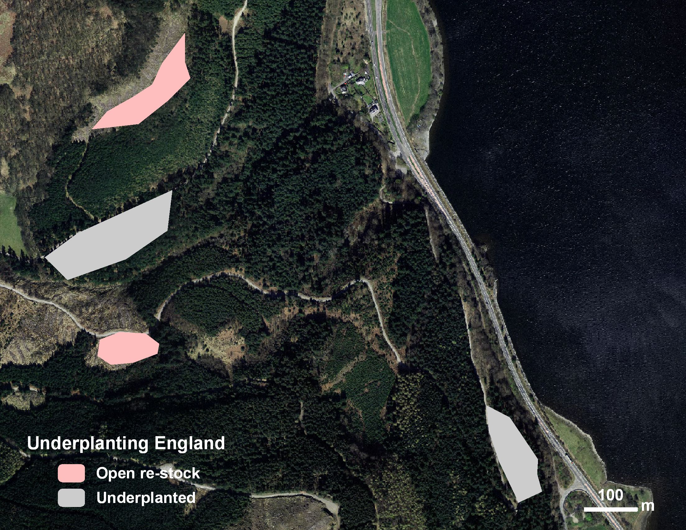 Under conditions of climate change restocking is likely to become increasingly challenging and require more intensive silvicultural care. This experiment examines the impact of microclimate on growth and survival of planted Douglas fir trees. Seedlings have been planted on open clearfell sites and under an irregular shelterwood to identify relationships between microclimate conditions and growth and survival of seedlings. The two forested compartments comprise of Douglas fir planted in 1927 as an even-aged stand. During the 10 years before planting the stands have been undergoing transformation to irregular shelterwood. One of the stands was thinned in 1996/7 and again in 2009/10 and had patchy understorey regeneration of 10-15 years old. The other stand was thinned in 1993/4 and 2006/7 and had less understorey regeneration. Parts of this stand have already been underplanted with Douglas fir. The two restocking areas were previously Sitka spruce, planted in 1963 and felled in 2006/7. These sites were mounded prior to replanting with Douglas fir.